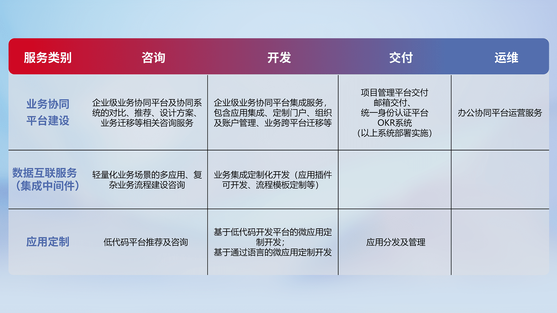 针对钉钉、、、、企微、、IDaas等平台级产品提供产品的规划、、、方案、、交付、、定制化开发等服务,,,实现如统一协同办公、、、、智能客户服务、、、混合会议管理、、智能数据查询、、、、等业务场景,,实现数字化转型。。。。